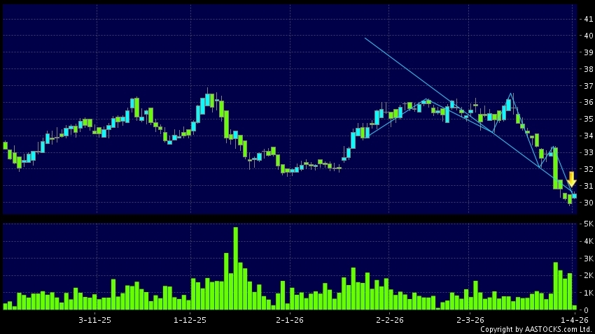 Head Shoulders top is a typical bearish signal, when stock price breaks the supportive level, downtrend would possibly start.(HK stocks quote is delayed for at least 15 mins.Short Selling Data as at 2026-04-01 16:25.)