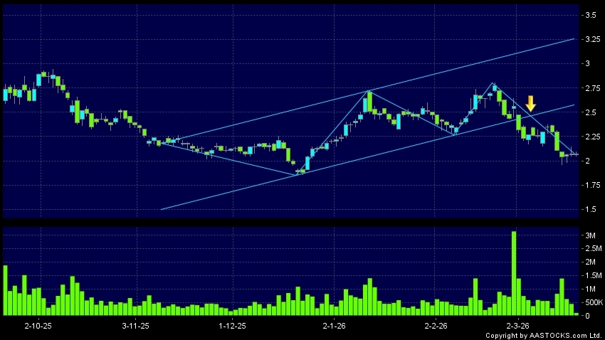 区域突破指股价在过去的一段时间只在一个范围在内活动,然後股价下跌作出突破,跌穿区域的底部,技术走势偏软。(港股报价延迟最少十五分钟。沽空资料截至 2026-03-19 16:25。)