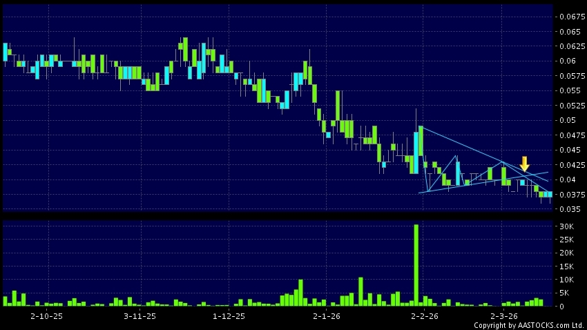 三角形向下突破是指股价的波幅渐渐收窄,在图表上形成三角形般的状态。股价在三角形的末端向下突破,下跌趋势形成,技术走势偏软。(港股报价延迟最少十五分钟。)