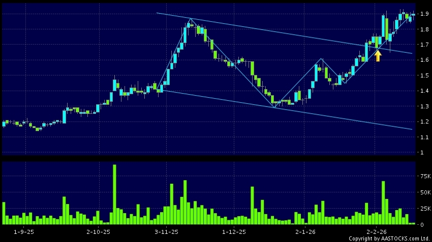 区域突破指股价在过去的一段时间只在一个范围在内活动,然後股价上升作出突破,升穿区域的顶部,技术走势向好。(港股报价延迟最少十五分钟。沽空资料截至 2026-03-20 12:25。)