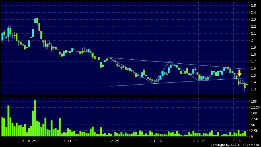 三角形向下突破是指股价的波幅渐渐收窄,在图表上形成三角形般的状态。股价在三角形的末端向下突破,下跌趋势形成,技术走势偏软。(港股报价延迟最少十五分钟。)