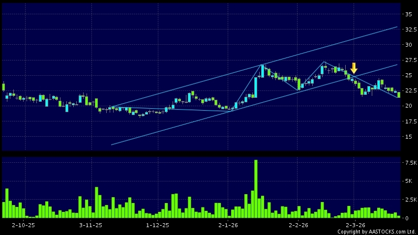 区域突破指股价在过去的一段时间只在一个范围在内活动,然後股价下跌作出突破,跌穿区域的底部,技术走势偏软。(港股报价延迟最少十五分钟。沽空资料截至 2026-03-25 16:25。)