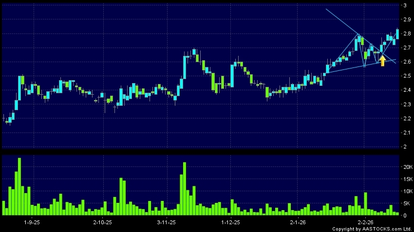 三角形向上突破是指股价的波幅渐渐收窄,在图表上形成三角形般的状态。股价在三角形的末端向上突破,形成上升趋势,技术走势向好。(港股报价延迟最少十五分钟。沽空资料截至 2026-03-18 16:25。)
