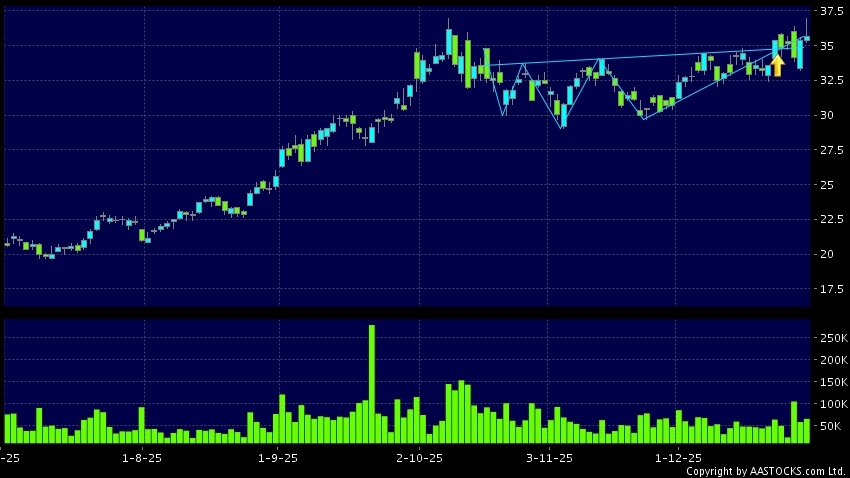 紫金矿业(02899.HK) +0.300 (+0.848%) 沽空 $3.53亿; 比率 15.065% 呈現頭肩底向上突破,股價升穿頸線。现价报35.660,上升0.848%,成交量6.51千万股,成交额23.45亿。