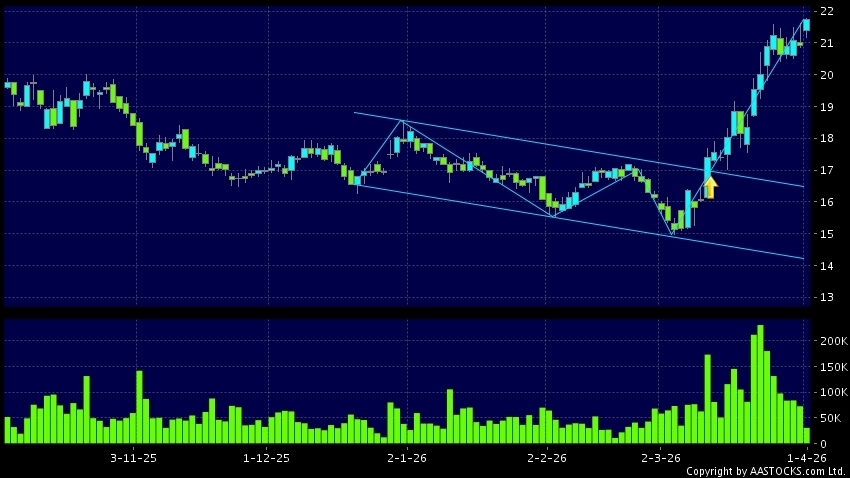 区域突破指股价在过去的一段时间只在一个范围在内活动,然後股价上升作出突破,升穿区域的顶部,技术走势向好。(港股报价延迟最少十五分钟。沽空资料截至 2026-04-01 16:25。)