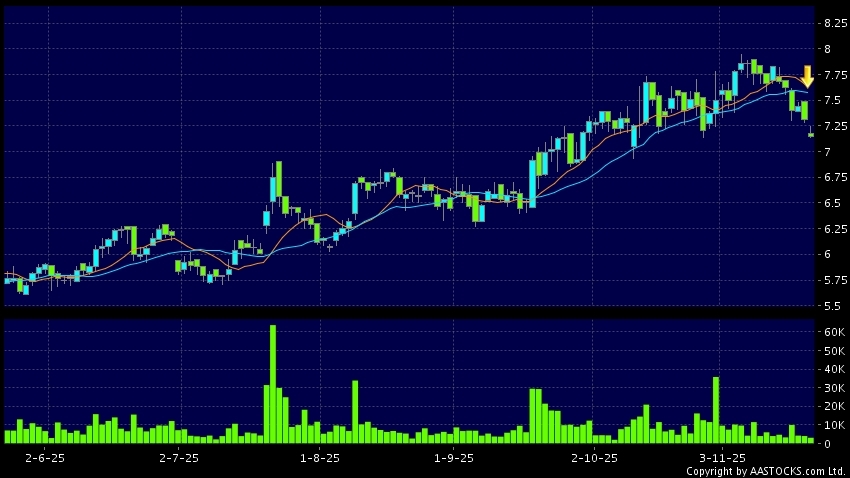 中聯重科(01157.HK) +0.070 (+0.966%) 沽空 $3.57百萬; 比率 9.958% 10天移動平均線跌穿20天移動平均線,出現死亡交叉。現價報7.130,下跌2.462%,成交量3.75百萬股,成交額2.69千萬。
