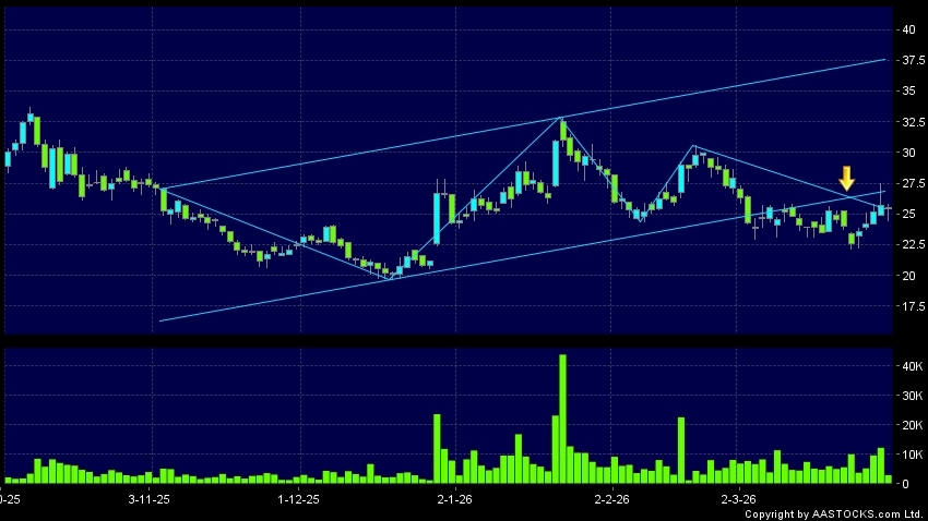 區域突破指股價在過去的一段時間只在一個範圍在內活動,然後股價下跌作出突破,跌穿區域的底部,技術走勢偏軟。(港股報價延遲最少十五分鐘。沽空資料截至 2026-03-30 12:25。)
