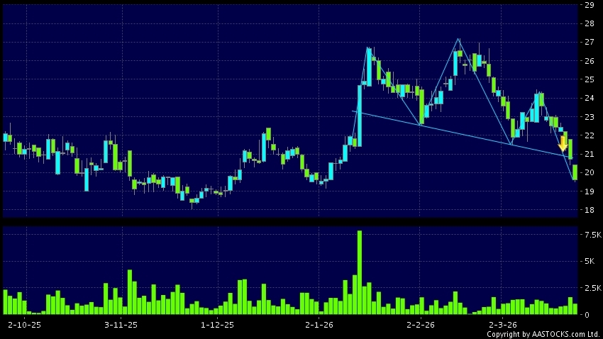 頭肩頂是典型的沽出訊號,當股價跌穿支持線(頸線)時,跌勢確認股價將持續下跌,技術走勢偏軟。(港股報價延遲最少十五分鐘。沽空資料截至 2026-03-25 16:25。)