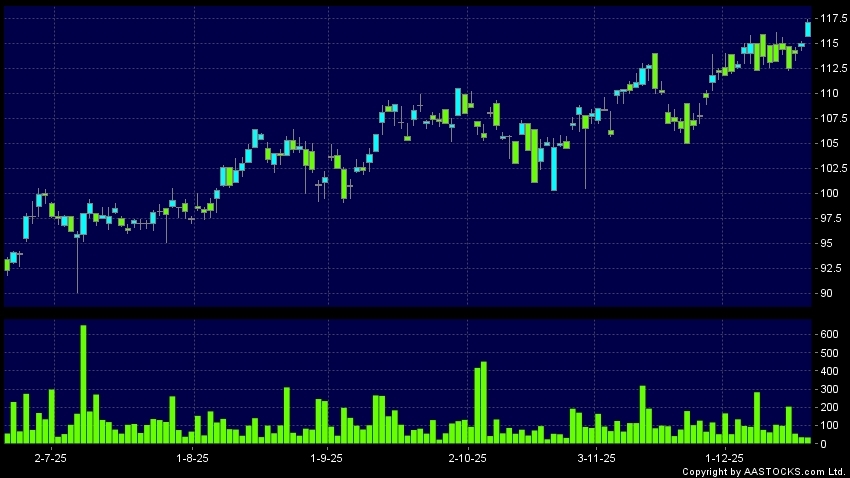 保誠(02378.HK) 0.000 (0.000%) 沽空 $7.21萬; 比率 2.634% 呈現杯柄形向上突破。現價報117.100,上升1.826%,成交量3.51萬股,成交額4.10百萬。