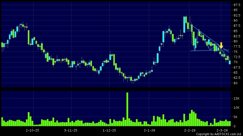 三角形向下突破是指股價的波幅漸漸收窄,在圖表上形成三角形般的狀態。股價在三角形的末端向下突破,下跌趨勢形成,技術走勢偏軟。(港股報價延遲最少十五分鐘。沽空資料截至 2026-03-06 16:25。)