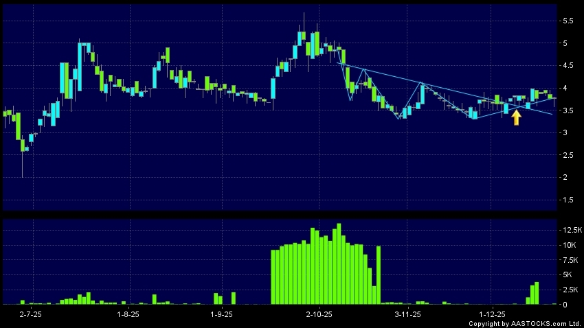 雲工場(02512.HK) +0.530 (+15.274%) 呈現頭肩底向上突破,股價升穿頸線。現價報3.770,無升跌,成交量17.10萬股,成交額62.49萬。
