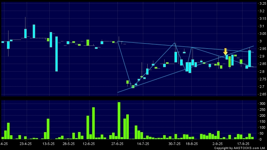 泓盈城市服務(02529.HK) +0.050 (+1.786%) 呈現三角形向下突破。現價報2.830,無升跌,成交量0.00股,成交額0.00。