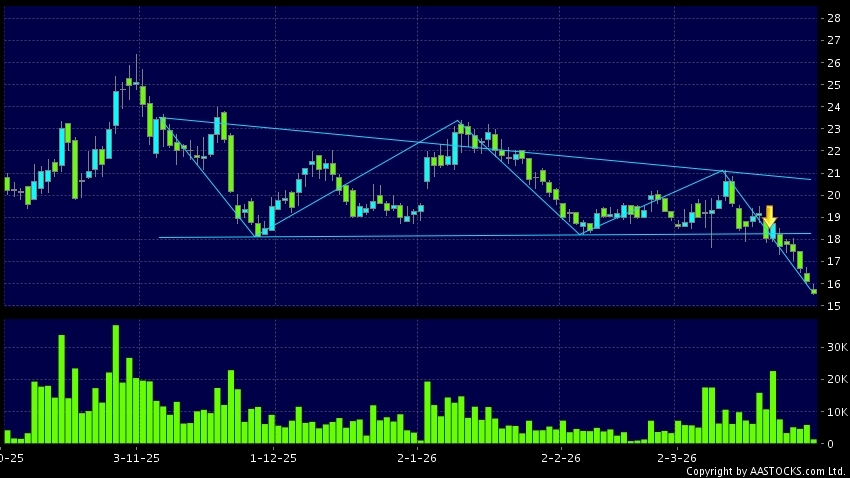 三角形向下突破是指股價的波幅漸漸收窄,在圖表上形成三角形般的狀態。股價在三角形的末端向下突破,下跌趨勢形成,技術走勢偏軟。(港股報價延遲最少十五分鐘。沽空資料截至 2026-03-31 16:25。)