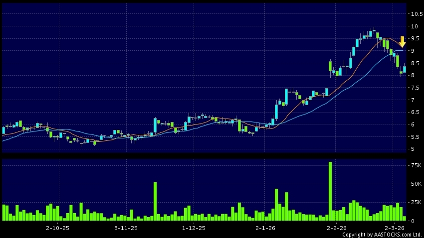 玖龍紙業(02689.HK) +0.140 (+1.716%) 沽空 $1.68千萬; 比率 20.981% 10天移動平均線跌穿20天移動平均線,出現死亡交叉。現價報8.360,上升3.465%,成交量6.70百萬股,成交額5.63千萬。