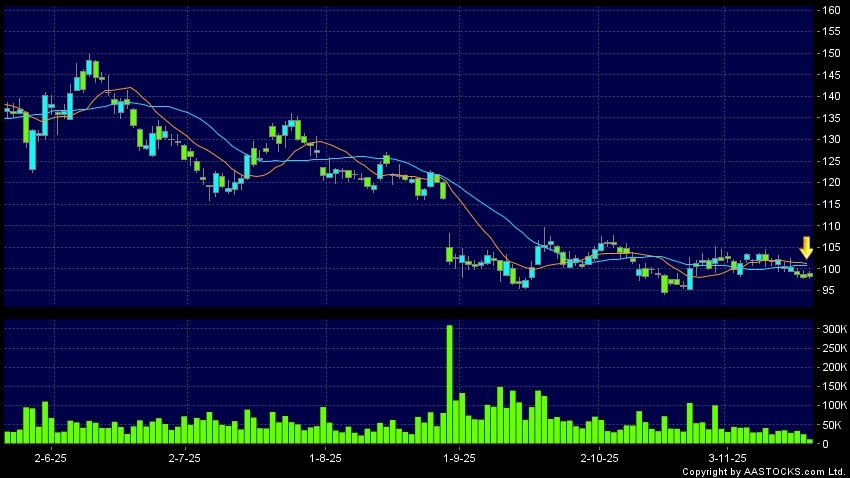 美團-W(03690.HK)  -2.950 (-2.995%)    沽空 $5.48億; 比率 12.371%   10天移動平均線跌穿20天移動平均線,出現死亡交叉。現價報98.200,上升0.204%,成交量1.20千萬股,成交額11.85億。