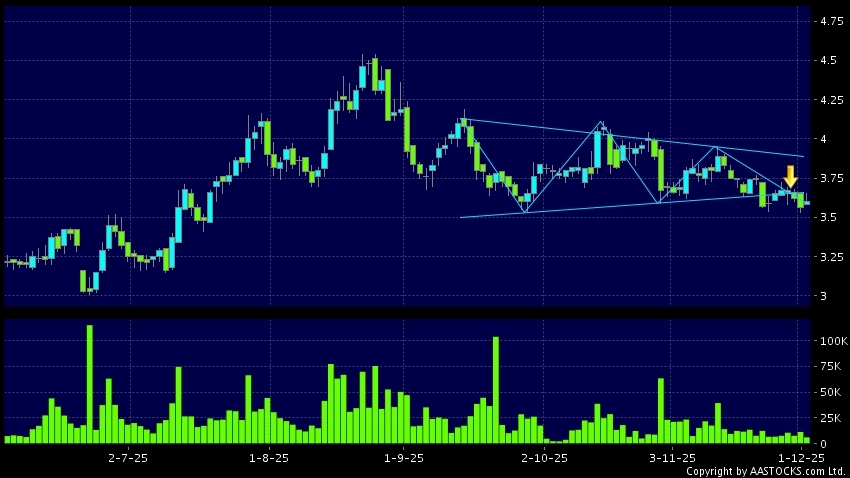 三角形向下突破是指股價的波幅漸漸收窄,在圖表上形成三角形般的狀態。股價在三角形的末端向下突破,下跌趨勢形成,技術走勢偏軟。(港股報價延遲最少十五分鐘。沽空資料截至 2025-12-09 16:25。)