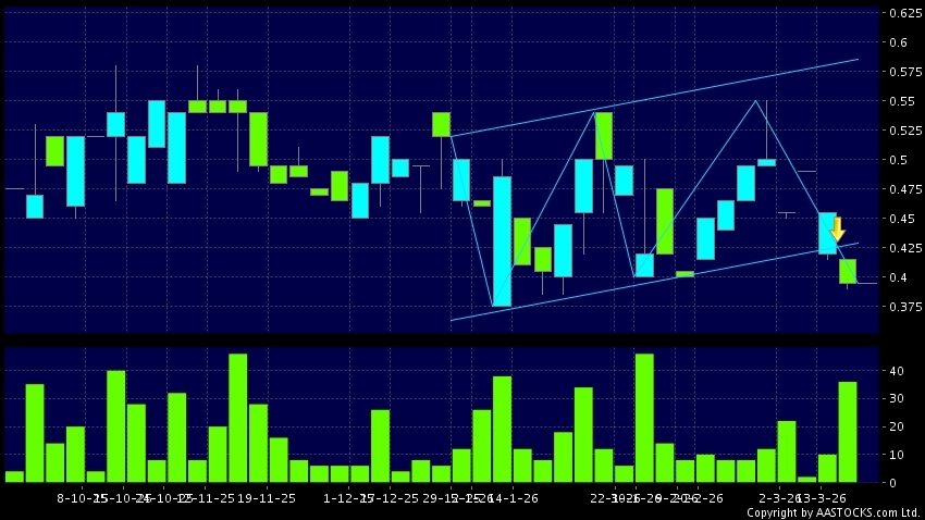 ZERO FINTECH(00093.HK)  0.000 (0.000%)   appears a downside range breakout. Last printed at 0.395; Flattish; on volume of 0.00 shares and turnover of $0.00