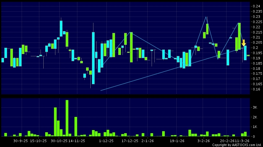 VESON HLDG(01399.HK)  +0.004 (+2.083%)   appears a downside breakout, dropped below the neckline. Last printed at 0.192; fell 4.950%; on volume of 34.00K shares and turnover of $6.56K