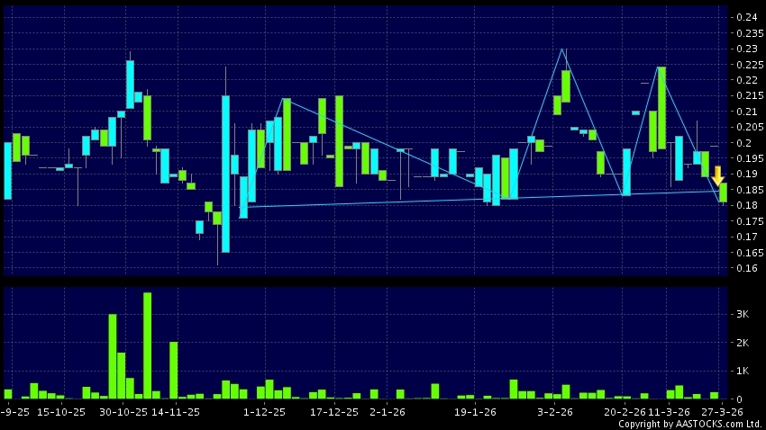 VESON HLDG(01399.HK) appears a downside breakout, dropped below the neckline. Last printed at 0.181; fell 9.045%; on volume of 8.00K shares and turnover of $1.48KRecent Performance...