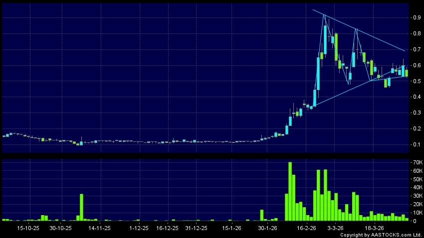 PUTIAN COMM(01720.HK)  +0.010 (+1.852%)   shows a triangle breakout. Last printed at 0.530; fell 11.667%; on volume of 3.59M shares and turnover of $1.97M