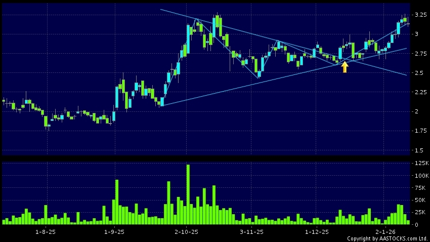 三角形向上突破是指股价的波幅渐渐收窄,在图表上形成三角形般的状态。股价在三角形的末端向上突破,形成上升趋势,技术走势向好。(港股报价延迟最少十五分钟。沽空资料截至 2026-01-13 16:25。)