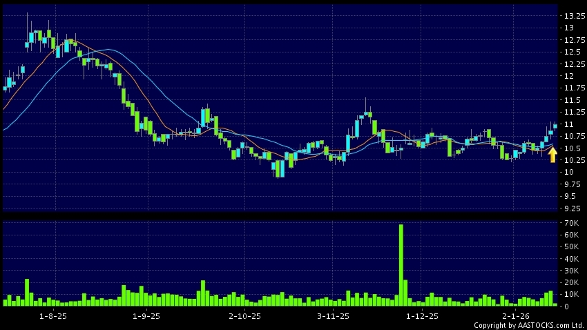 中国民航信息网络(00696.HK)  -0.150 (-1.381%)    沽空 $5.69百万; 比率 7.754%   10天移动平均线升穿20天移动平均线,出现黄金交叉。现价报10.980,上升1.105%,成交量2.43百万股,成交额2.66千万。