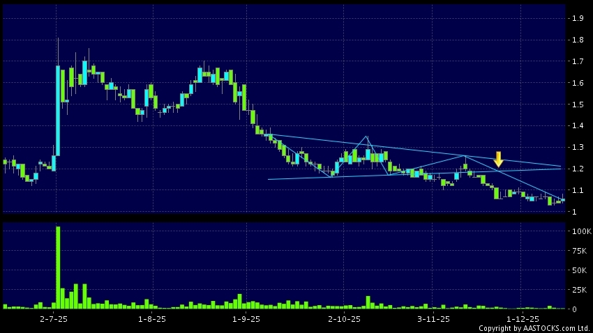 三角形向下突破是指股价的波幅渐渐收窄,在图表上形成三角形般的状态。股价在三角形的末端向下突破,下跌趋势形成,技术走势偏软。(港股报价延迟最少十五分钟。)