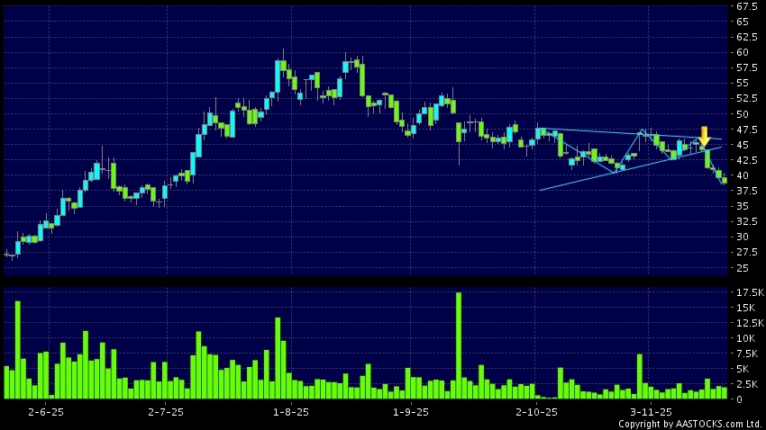 三角形向下突破是指股价的波幅渐渐收窄,在图表上形成三角形般的状态。股价在三角形的末端向下突破,下跌趋势形成,技术走势偏软。(港股报价延迟最少十五分钟。沽空资料截至 2025-12-12 16:25。)