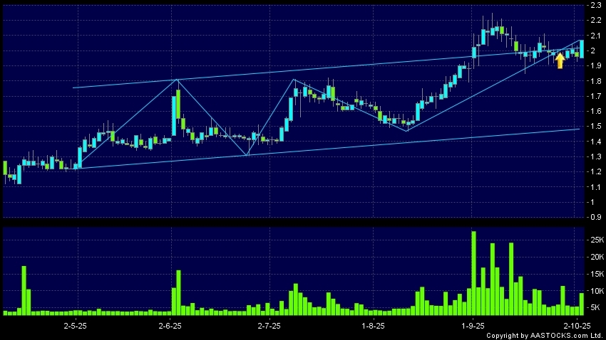 国富量子(00290.HK) -0.020 (-0.948%) 沽空 $1.87百万; 比率 13.900% 呈现区域上轨突破。现价报2.050,上升4.592%,成交量9.65百万股,成交额1.94千万。