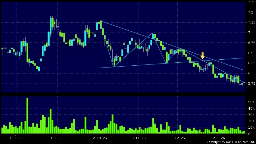 三角形向下突破是指股价的波幅渐渐收窄,在图表上形成三角形般的状态。股价在三角形的末端向下突破,下跌趋势形成,技术走势偏软。(港股报价延迟最少十五分钟。沽空资料截至 2026-01-21 16:25。)