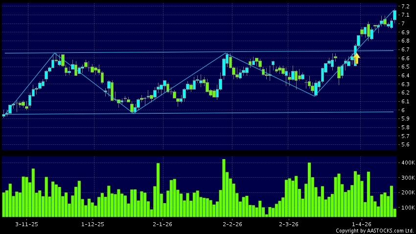 区域突破指股价在过去的一段时间只在一个范围在内活动,然後股价上升作出突破,升穿区域的顶部,技术走势向好。(港股报价延迟最少十五分钟。沽空资料截至 2026-04-20 16:25。)
