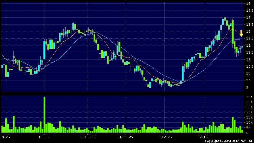 赤子城科技(09911.HK) -0.320 (-2.707%) 沽空 $2.06百万; 比率 11.019% 10天移动平均线跌穿20天移动平均线,出现死亡交叉。现价报11.940,上升0.845%,成交量2.43百万股,成交额2.90千万。