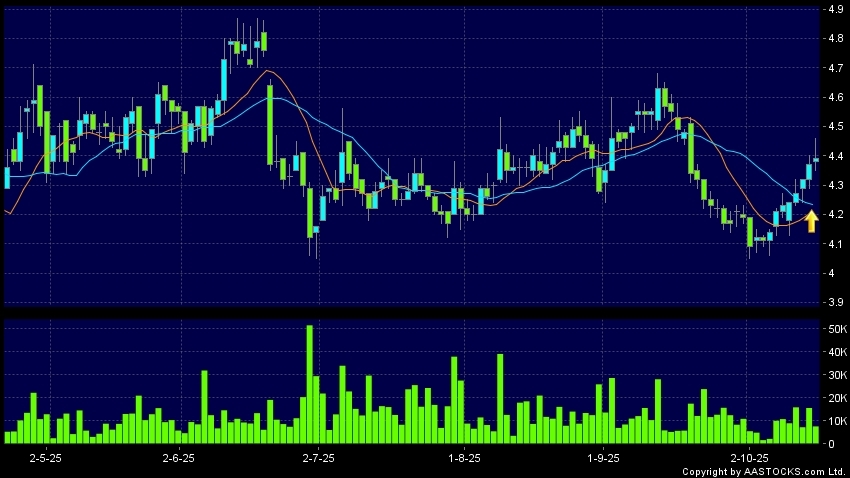 華電國際電力股份(01071.HK) -0.010 (-0.229%) 沽空 $4.17百萬; 比率 7.321% 10天移動平均線升穿20天移動平均線,出現黃金交叉。現價報4.390,上升0.458%,成交量7.58百萬股,成交額3.34千萬。