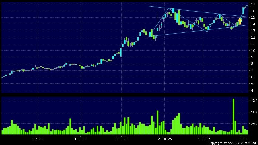 中國有色礦業(01258.HK)呈現三角形向上突破。現價報16.760,上升1.453%,成交量1.13千萬股,成交額1.86億。最近表現:3日 +12.107%5日 +22.336%10日 +19....