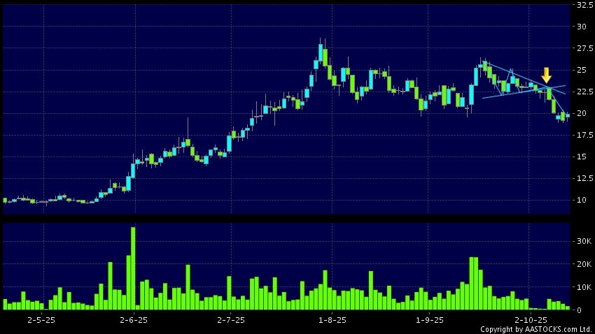 三角形向下突破是指股價的波幅漸漸收窄,在圖表上形成三角形般的狀態。股價在三角形的末端向下突破,下跌趨勢形成,技術走勢偏軟。(港股報價延遲最少十五分鐘。)