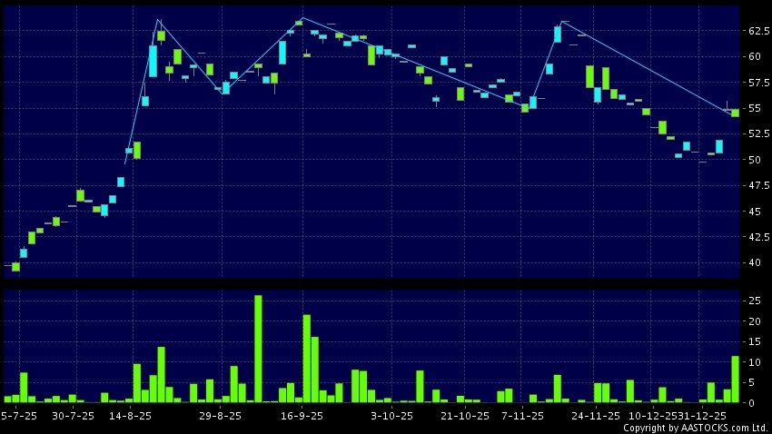 京東健康-R(86618.HK) +1.650 (+2.978%) 呈現三重頂突破向下。現價報54.500,下跌0.729%,成交量1.15萬股,成交額62.80萬。