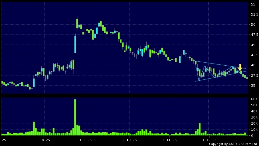 三角形向下突破是指股價的波幅漸漸收窄,在圖表上形成三角形般的狀態。股價在三角形的末端向下突破,下跌趨勢形成,技術走勢偏軟。(港股報價延遲最少十五分鐘。沽空資料截至 2025-12-31 12:25。)