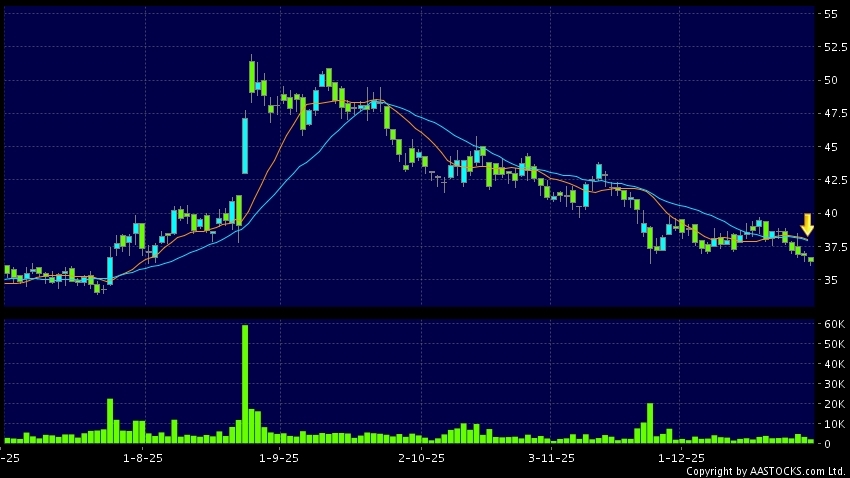 名創優品(09896.HK) -0.400 (-1.087%) 沽空 $5.30百萬; 比率 6.831% 10天移動平均線跌穿20天移動平均線,出現死亡交叉。現價報36.400,下跌1.087%,成交量2.14百萬股,成交額7.76千萬。