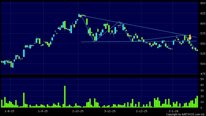 三角形向下突破是指股價的波幅漸漸收窄,在圖表上形成三角形般的狀態。股價在三角形的末端向下突破,下跌趨勢形成,技術走勢偏軟。(港股報價延遲最少十五分鐘。沽空資料截至 2026-01-23 16:25。)