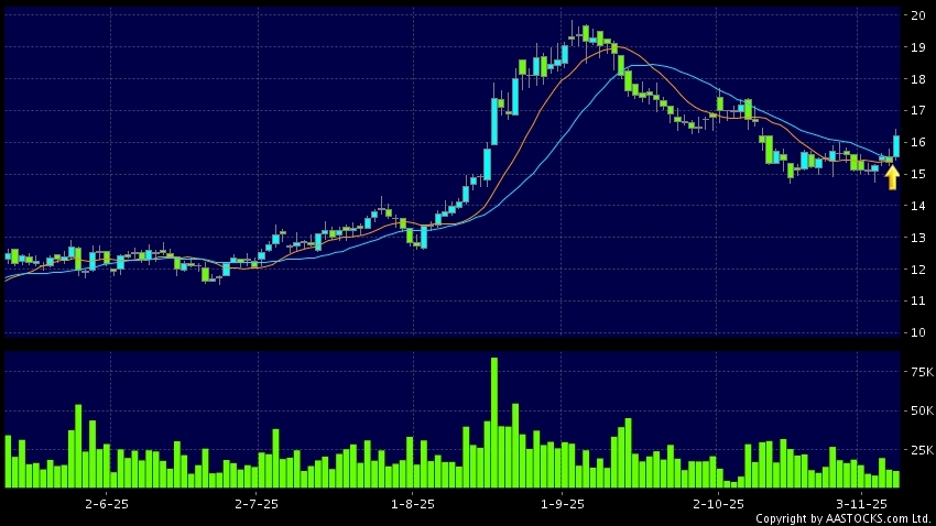 長城汽車(02333.HK) +1.260 (+8.192%) 沽空 $8.12千萬; 比率 12.111% 10天移動平均線升穿20天移動平均線,出現黃金交叉。現價報16.180,上升5.202%,成交量1.22千萬股,成交額1.97億。